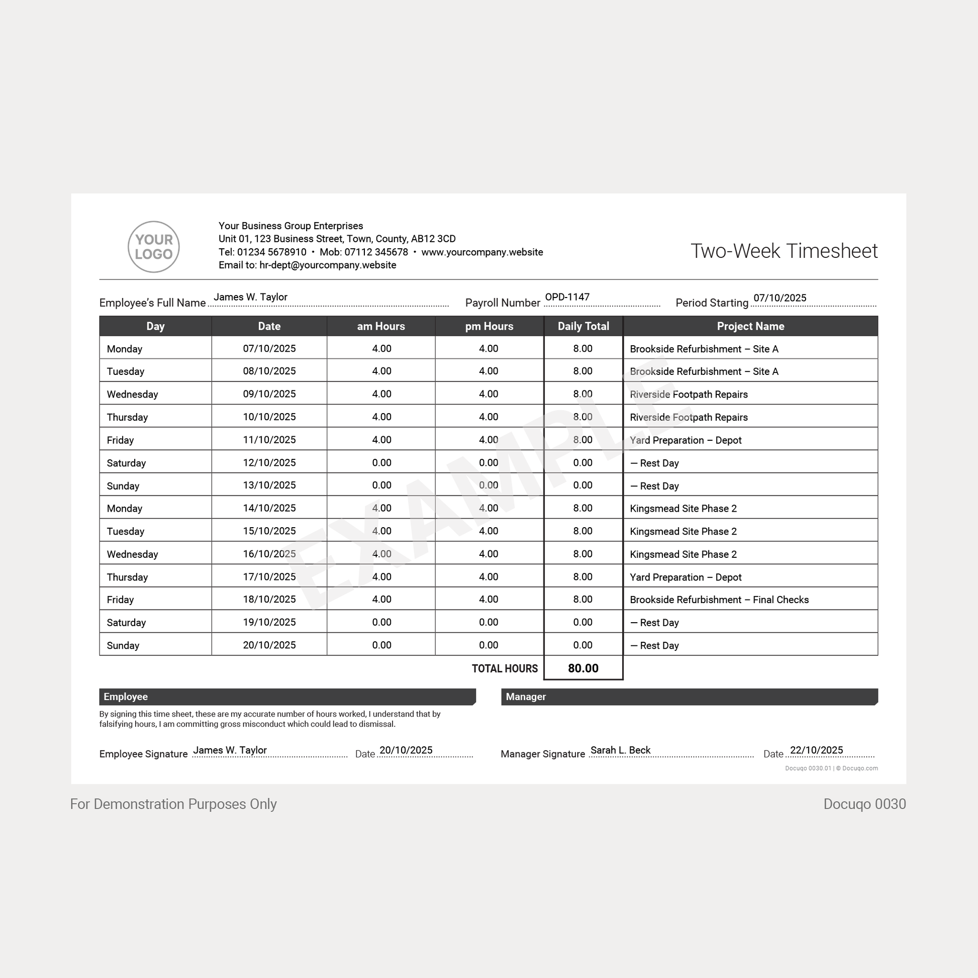 This pack includes all three of Docuqo’s best-selling timesheet formats — Weekly, Two-Weekly, and Monthly — giving you complete flexibility to match your company’s working patterns. Whether you’re managing a single site team, a rotating workforce, or multiple projects, these clear and reliable forms make time recording easy, accurate, and fully auditable.