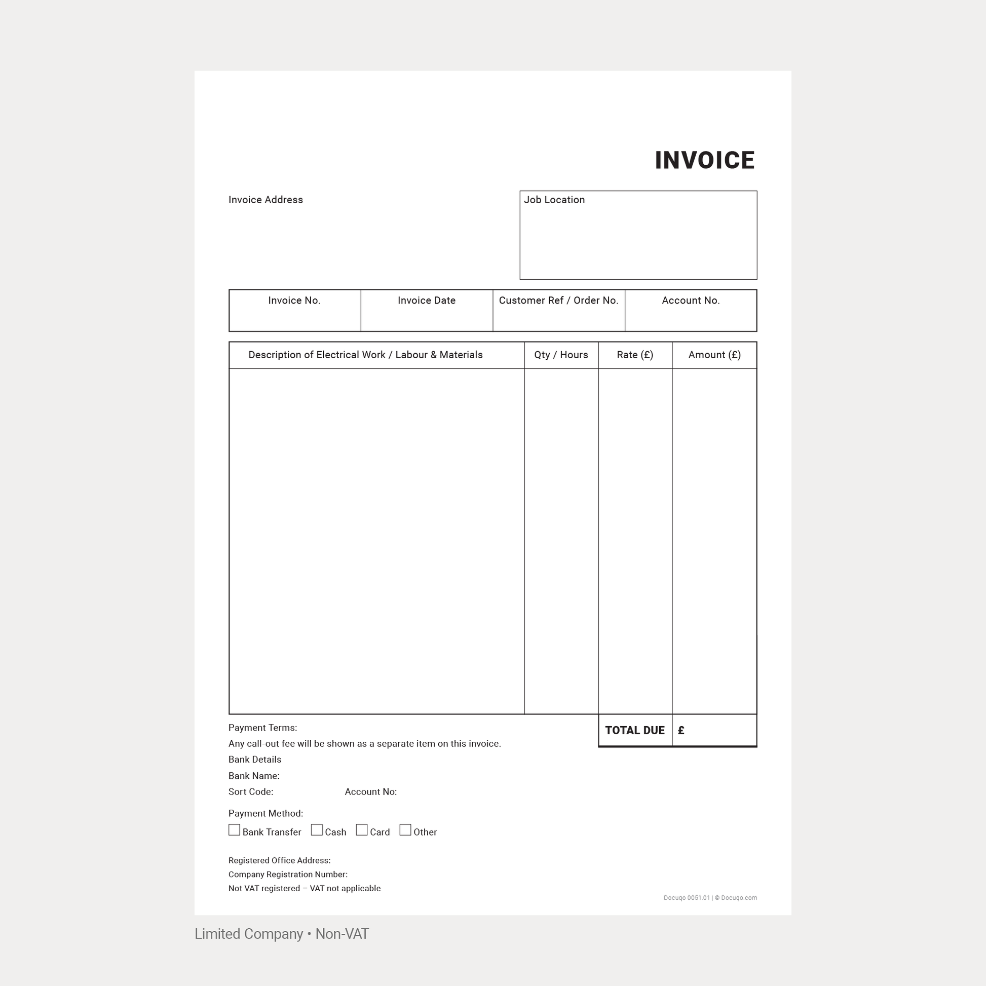 Electrician Invoice Complete Pack UK – VAT & Non-VAT A4 Fillable PDFs for Ltd, Partnership & Sole Trader (Docuqo 0052)