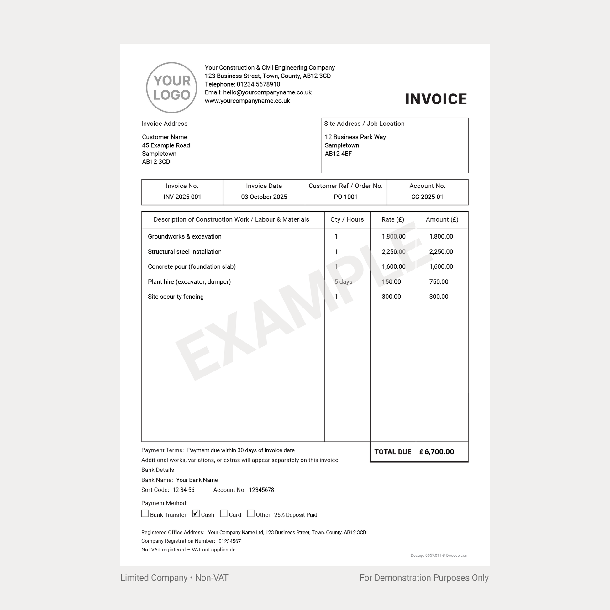 Construction Invoice Template Pack UK – VAT & Non-VAT A4 Fillable PDFs for Limited, Partnership & Sole Trader (Docuqo 0058)