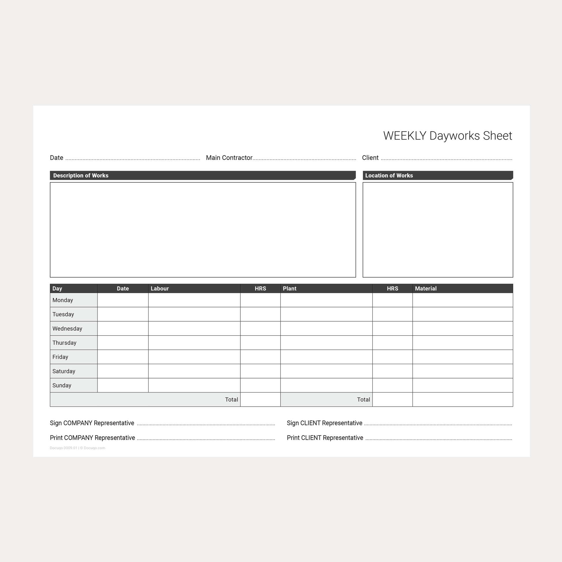 Weekly Dayworks Sheet Template – Fillable PDF A4 Download (Docuqo 0009)