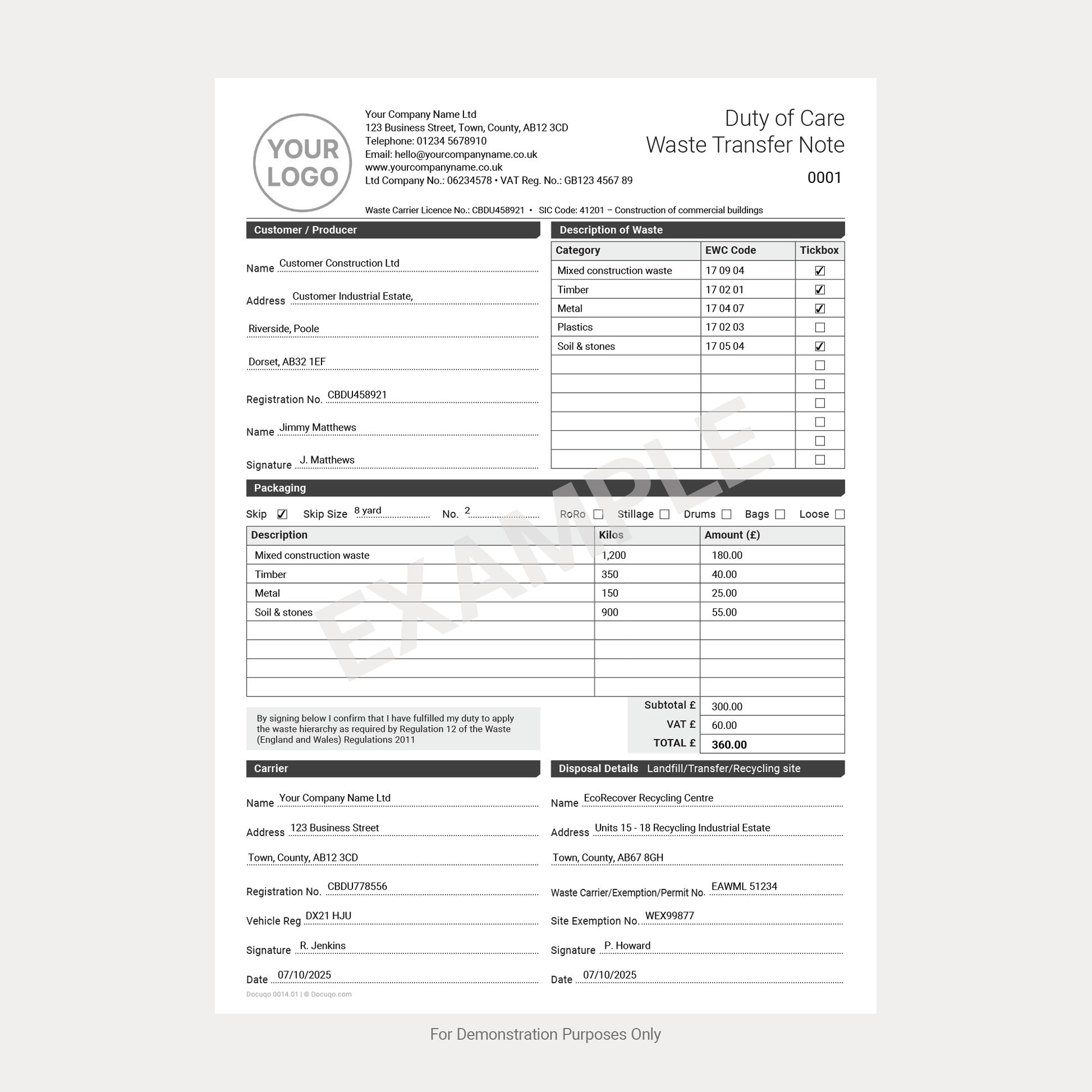 - Compliant wording – includes “Duty of Care” declaration required under UK Waste Regulations