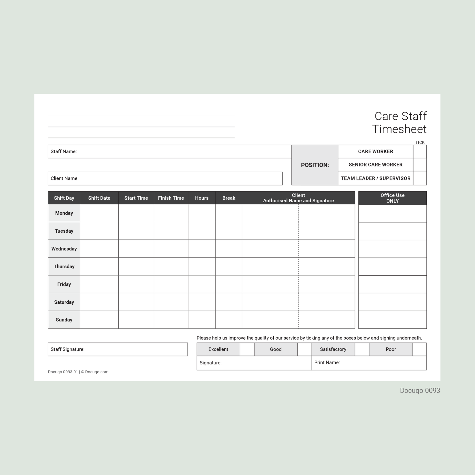 - Care Staff Weekly Timesheet (Docuqo 0093) – For care workers, senior carers & supervisors