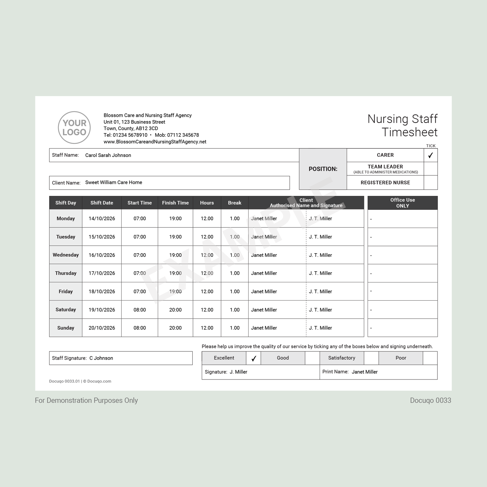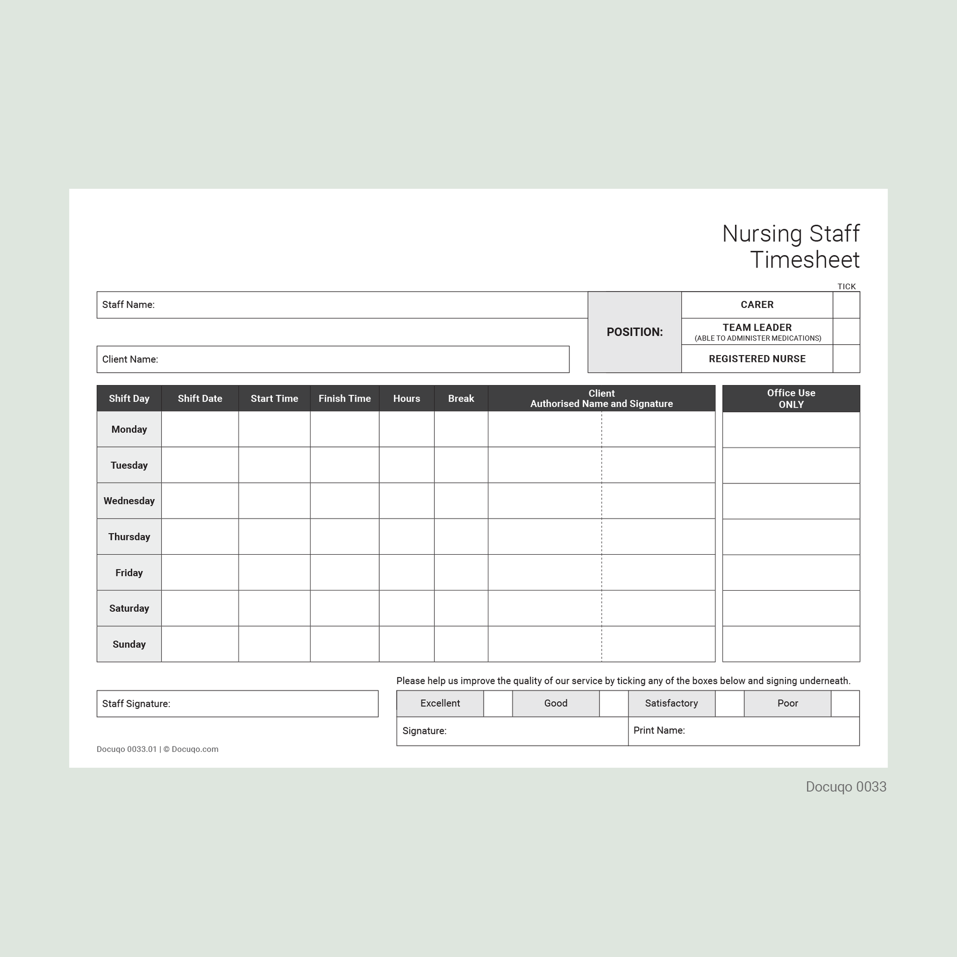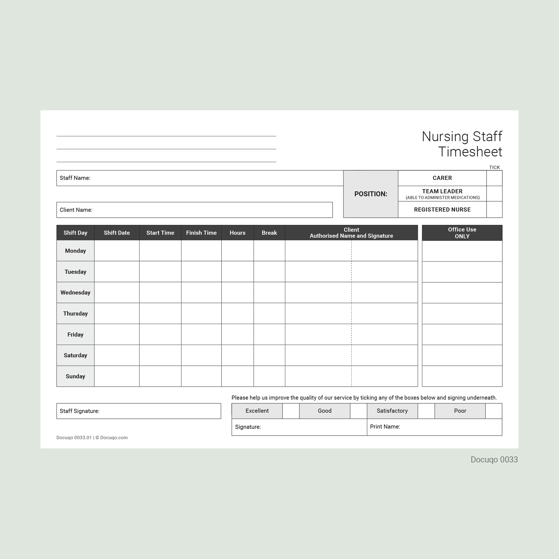 Nursing Staff Weekly Timesheet (Docuqo 0033) – For registered nurses, carers & team leaders